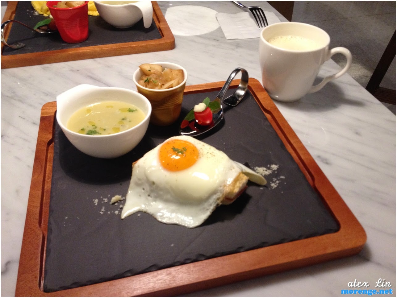 除了自助區外,每個人還有一份套餐可用,有三明治、歐姆蛋和法國土司可選擇,飲品杯豆漿,不過豆漿太高纖了,言下之意就是渣渣感很重,不知道很潮的新人類能不能接受就是了